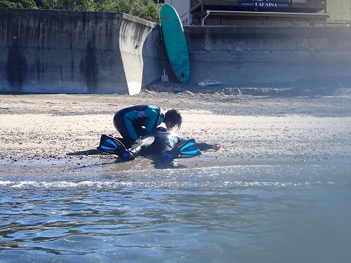 5秒に1回の吹き込みで肺に空気を送り込みながら、浜辺へ上げます。