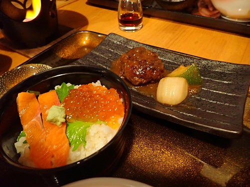 なんかの肉のハンバーグ(かじった後)と鮭親子丼。